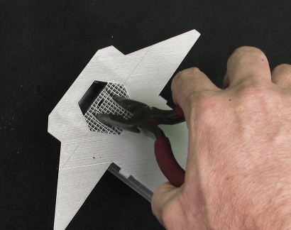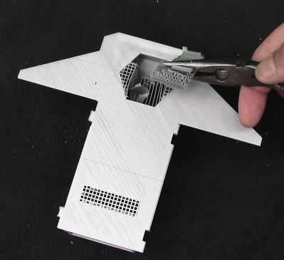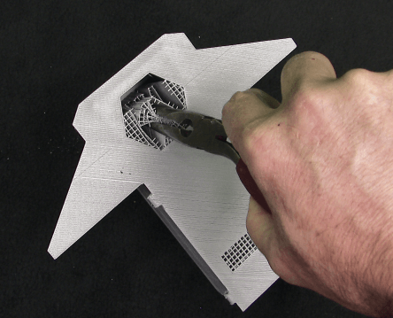 To remove the supporting material, just cram some needle nose pliers in and twist and pull. Repeat that a couple times to quickly tear out all the supports for the mid goal: