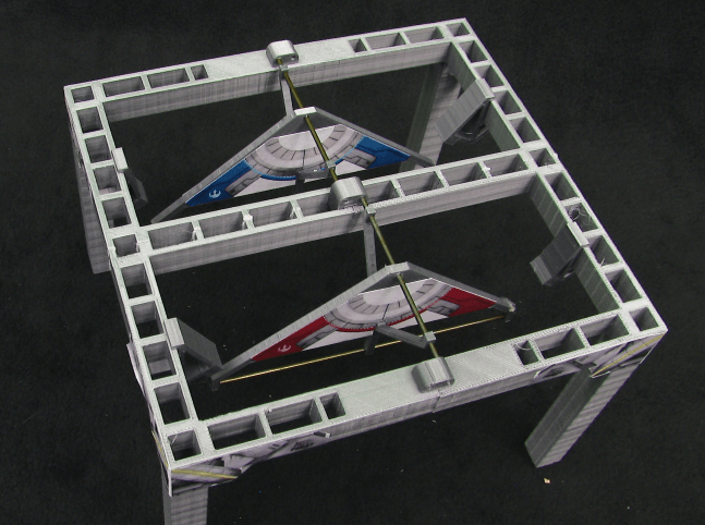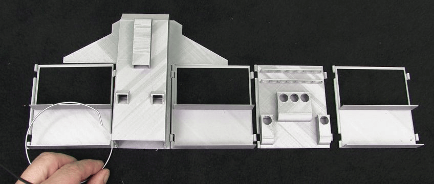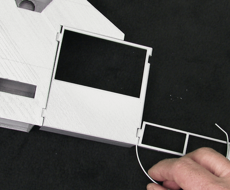 Assemble 8 guard rails by inserting enough filament to span the hinges (don’t need to go all the way up the wall). Trim excess filament off. No need to glue it in place.