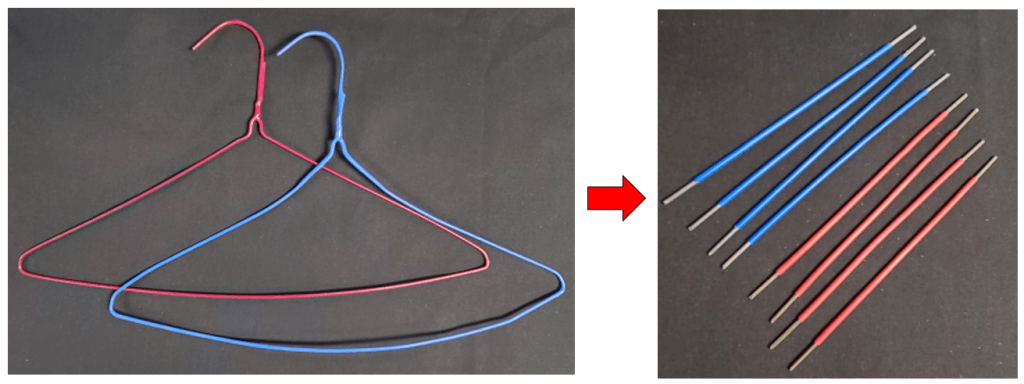 Step 5: Assemble Hangers using coat hanger wire (or something similar with a ~2mm diameter) cut to 140mm lengths. In this example we used some RED and BLUE plastic coated coat hangers, cut to length and stripped at both ends: