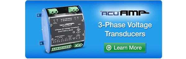 AcuAMP 3VACT series transducers provide True RMS voltage measurement on each phase of three-phase AC systems. Each unit offers individual 4–20 mA outputs per phase plus a fourth output for average voltage. Supporting both Delta and Wye configurations, they feature input ranges up to 600 VAC and are available with line-to-line or line-to-neutral sensing options. A non-adjustable phase loss relay output provides added circuit protection.
