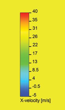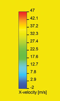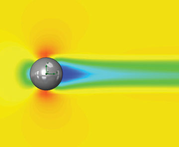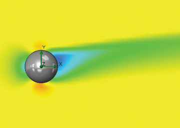 The first flow diagram shows a stagnation point at the front of the ball where the air velocity is very low. On the backside of the ball (dark blue area), some of the air actually moves in the direction of the ball’s motion. The red areas, both above and below the ball, show that the airflow reaches a maximum velocity just above and just below the ball. This is due to the ball having the largest frontal area at that section perpendicular to the air flow.
