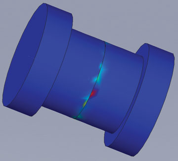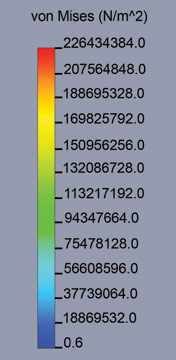 The team also modeled several pressure contours, shear graphs, and flow trajectories. The value for the coefficient of drag (Cd) for all the calculations averaged 0.242. The average value for the coefficient of lift (Cl) for all calculations was 0.466. The team performed a Finite Element Analysis (FEA) on a critical shoulder bolt that holds (and helps to position) the 140 pound launching head assembly. Due to the complex detail of the actual bolt used, a simplier version was created for FEA testing. The static stresses on the bolt were determined to be 65 MPa with a displacement of 0.3 millimeters. The material of the bolt is medium carbon steel with a yield strength of 350 MPa. Since the maximum stress on the bolt is far below the yield strength, this off-the-shelf bolt was deemed acceptable for the application. (Figure 7)