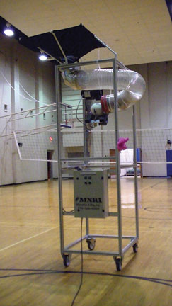 The mechanical set-up uses two wheel/tire assemblies driven by the Ironhorse motors – one above and one below the volleyball. While the two motors work in concert to determine the overall velocity of the launch, the machine can also impart varying degrees of top-spin to the ball by running the upper motor somewhat faster than the lower motor. Top spin and speed are the primary variables used by volleyball players to vary their serves, and the machine allows a coach to vary both speed and top-spin from the remote control. The mechanical setup also allows for manual adjustments to various angles of the ‘launch head’ delivery mechanism to allow a wide variety of ‘serve’ and ‘set’ simulations.
