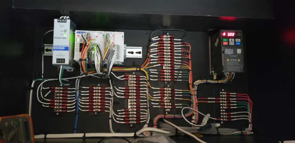 The design took a bit of iteration, and S&C along with one of the coach builders made a test jig so they could prove out the function in the convenience of their shop. The first idea was to run the VFD on a time basis, but this was not very accurate and resulted in the door bumping into each end-of-travel, and sometimes slipping the belt. However, by incorporating limit switches and monitoring the current draw, they could provide fine control of the door movement and stop it immediately as it snugged into each end point. Current monitoring was also essential as a safety function because any blockage due to a person, pet, or other item in the way of the door would be detected as the motor was forced to work a little harder, and movement would be commanded to stop.