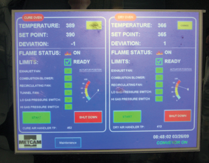 The finishing department project involved integration of a control system with SCADA capability. The first phase required increasing the capacity of the existing cure and dry ovens. The two ovens operate independently of each other with their own heat source. Each oven is a direct fired natural gas convection type.