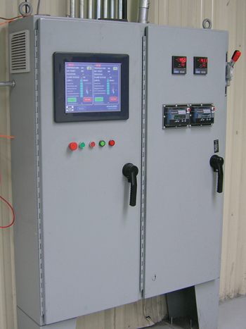 After mapping the I/O points, a DL260 programmable logic controller was selected as the main processor. Discrete inputs and outputs handle basic operator functions and feedback. Analog I/O includes temperature monitoring as well as actuator control for the main gas valve to control heat. All temperature sensors are Automation Direct’s J-type thermocouple FC-T1 signal conditioners. The use of signal conditioners reduced rack space and simplified wiring, by eliminating long thermocouple wire runs back to the control system.