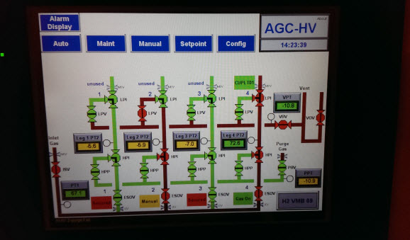 Most of the time, this AGV system is delivering gas while monitoring multiple pressure transducers and flow switches to check for proper pressure and flow. Leaks, low gas supply, valve failures and manual valve closure can be detected by falling or rising pressure. Gas pressure out-of-limit faults must be corrected immediately.
