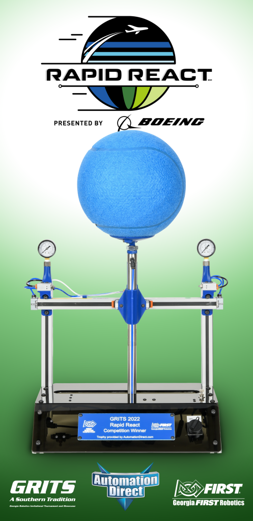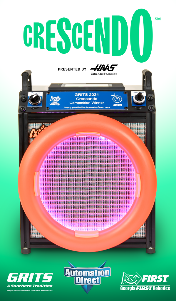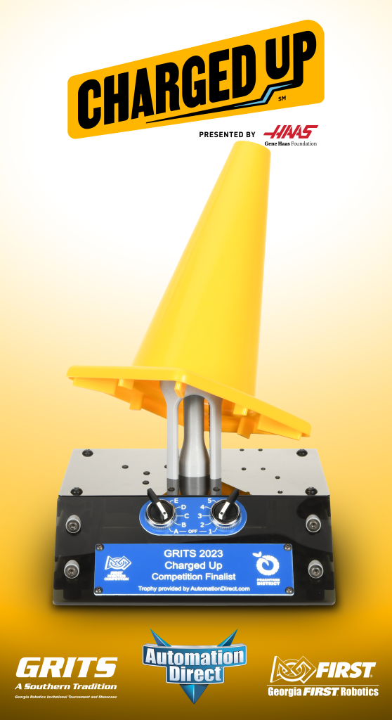 GeorgiaFIRST Robotics is the state organizing body for FIRST events in Georgia, and in addition to all the official activities they also sponsor an off-season event affectionately known as GRITS (The Georgia Robotics Invitational Tournament and Showcase). This relaxed, fall event is one last chance for the FRC teams in Georgia to compete with their previous years’ robot, before the new game is announced in January. Starting in 2013, AutomationDirect began to supply the trophies for this event. And these are not just any trophies; these highly coveted constructions combine visual elements from the current year’s game with some form of automation. From the pneumatic raising-and-lowering of a Frisbee, to a guitar amp that plays the sounds of the FRC game, these trophies spin, whirl, shuttle, and oscillate under the control of various pushbuttons, sensors, or even touchscreens. For 12 years, summer interns working at AutomationDirect have crafted enough trophies to reward the finalist and winning alliances (groups of three teams), as well as several judged awards at the GRITS event. It’s all in the spirit of promoting, inspiring and recognizing science and technology for the young people who will lead the way for a better future.