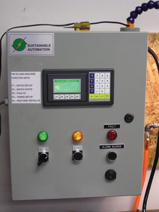 Sustainable Automation optimized the performance of the lock pin laminating machine by analyzing process flow and organizing tasks into groups that could execute in parallel. All actuator response delays are user-definable via the touchscreen, allowing the operator to tune the controls according to the actuator performance. A NEMA 4/12 cabinet protects the electrical components from the plant environment.