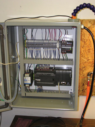 Sustainable Automation used an AutomationDirect DL06 PLC, a cost-effective controller for an application requiring only discrete I/O. The DL06 is programmed using DirectSOFT, a versatile language that allows the code to be easily changed as the machine evolves. A programmable C-more® Micro touchscreen operator interface mounted on the door of the control cabinet provides easy data entry, screen navigation, and alarm annunciation.