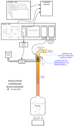 Our small team wanted to try applying big-industry practices to small-scale process application. We would test using a cost-effective, yet capable, programable logic controller (PLC), human-machine interface (HMI), various instrumentation, and control elements to operate a pilot still for increasing the strength of ethanol for beverage use. Such a “moonshining” application is legally confusing as there are many possible regulations. U.S. federal prohibitions largely remain in effect, although they have been challenged effectively in court. Individual states differ on the topic, and many countries have relaxed regulations. Anyone considering taking this up should research local legal restrictions. Safety is also important, with general hobbyist guidelines recommending against distilling a wash above 40% ethanol. The thought that a home distillation setup can compete on price with commercially available options simply isn’t practical, as is the case with home-brewed beer.
