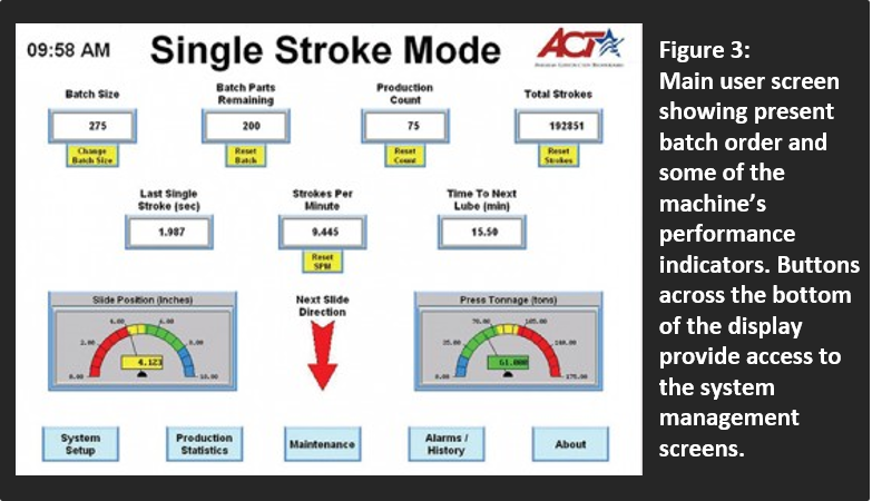 Adding a powerful PLC and HMI panel to the 175-ton hydraulic forming press gave the operators the ability to perform touchscreen commands to automatically control the press, eliminating the need for manual adjustments (Figure 2). In addition, the new automation system stores multiple programs or recipes, improving both cycle times and positional accuracies. Prior to the rebuild, operators had to manually enter the program parameters for each new job. Now, the press operator simply selects the desired recipe, which contains values that have been checked through qualifying runoffs (Figure 3). Another key feature of the system is statistical analysis of the press’ performance. This enables SMG machine owners to detect potential hydraulic issues early on, and also ensures that the machine operates within established parameters. SMG also created additional quality checks to ensure the machine was running according to its specifications. The automation system now measures the depth of the press as it presses on a part. Operators now know the depth of a motion to 1/100th of an inch on a 6 to 7 inch stroke length. This helps them predict when the die needs sharpening, or when the hydraulics need repair. The reversal of the press is a critical production process as it prevents parts from falling out of tolerance. Prior to the rebuild, the old automation system required a manual proximity switch to signal positioning on reversal. Unfortunately, the manual switch accuracy was dependent on the steadiness of the operator’s hand. The new PLC-based automation system has automated the reversal of direction step, which is now based on measured pressure. This has made the depth of the press motion extremely consistent, ensuring part uniformity and extending the life of the machine. As efficiency increases due to automation and improved operation, wear on the oil and hydraulic components is reduced. If the press depth starts to change, it’s usually an indication of a hydraulic leak or a problem with the die that helps form the part. By being able to address these issues before the machine goes out of tolerance, SMG can keep operating without unscheduled downtime.