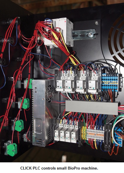 Creating bio diesel from common waste oils is an interesting and somewhat complex chemical processing operation, but this complexity is unburdened from the end user by automation. The BioPro relies heavily on Programmable Logic Controllers (PLCs) from AutomationDirect (www.automationdirect.com) to control all the various functions of the machine, making the PLC the brains of the machine. For example, the PLC tells the machine when and how long mixing occurs, when and how pumping occurs, when draining begins, etc.