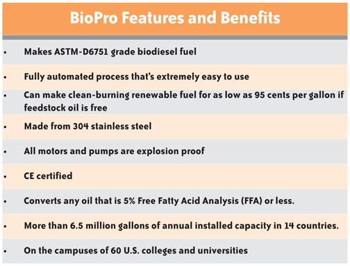 For example, a university uses our BioPro 380EX, which makes 100 gallons of bio diesel from 100 gallons of cooking oil every 23 hours, to make 2400 gallons per month. In this scenario, payback for the machine and labor is achieved in only in three and a half months, assuming regular diesel is four dollars a gallon.