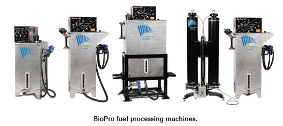 Our machines span from the BioPro 150 which makes 40 gallons every 48 hours, to the BioPro380EX in line with a SpringPro T76 which makes 100 gallons every 13 hours. Cost per gallon is determined largely by the number of gallons made, and the cost of the oil feedstock.