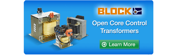 The new BLOCK open core control transformers are RoHS compliant, CE marked, and come with a 3-year warranty. The CT series is UL Recognized and starts at $53.00, while the USTE series is UL Listed and starts at $64.00.