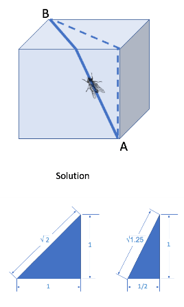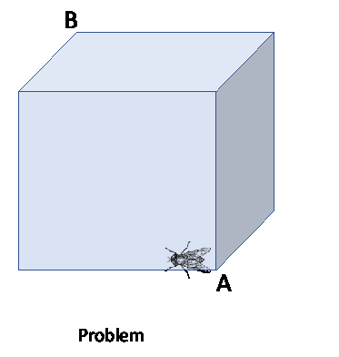 While the run-of-the-mill house fly might follow the path indicated by the dotted line below, it would need 2.41 minutes (1 + sq. root 2) to reach B. The clever fly would take the more direct (solid line) path, and reach B in 2.236 minutes (2 * sq. root 1.25)