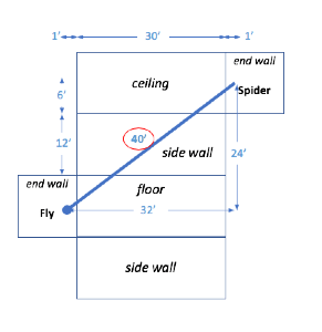 If the spider takes a direct path (parallel to the side walls), it would go up one foot, along the ceiling for 30 feet, and then 11 feet down the far wall, for a trip distance of 42 feet.