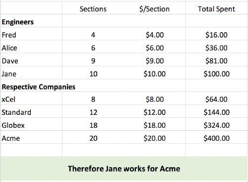 Four automation firms along with an engineer from each firm went shopping for cable. Each company bought twice as many sections of cable as their engineer, and each purchaser bought as many sections of cable as the number of dollars paid for each section. Acme spent $76 more than Globex; Dave bought three sections less than Standard; Alice bought two sections more than Fred, who spent $48 less than xCel. What company does Jane work for?