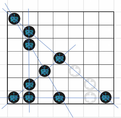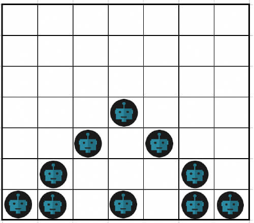 The puzzle factory has a grid of 49 robotic work cells, but only 10 robots are currently installed as shown in the illustration below. One morning the eccentric factory owner declares that three (and only 3) of the robots should be moved to new work cells, such that the robots will be aligned into five rows, with four robots in each row. Can you find a way to achieve her whimsical placement request?