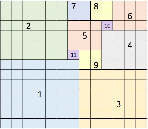 Cutting only along the grid lines, what is the smallest number of square pieces into which you can dissect this image?