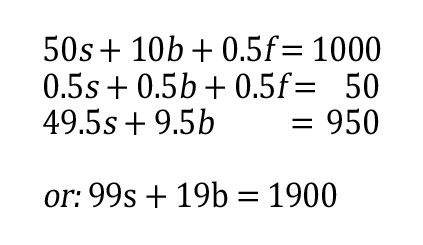 Let s=number of sensors, b=number of bases, and f=number of fittings. We know that 50s+10b+0.5f=1000, and that s+b+f=100 (which can also be stated: 0.5s+0.5b+0.5f=50)