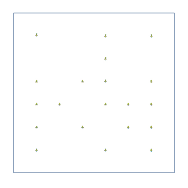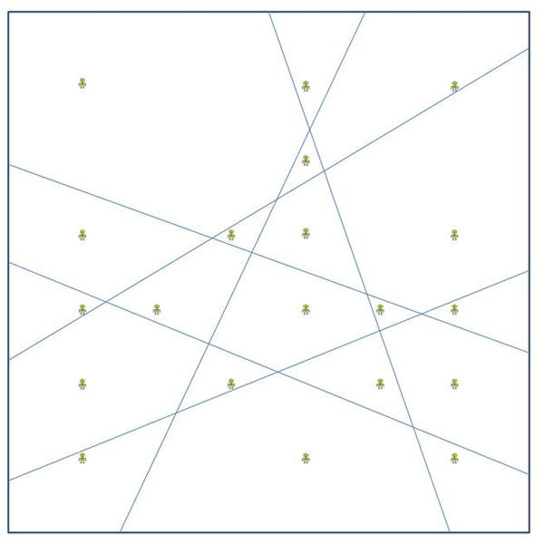 The puzzle factory has twenty robots on the factory floor, laid out as shown on a grid. The safety manager wants to install fencing on the plant floor to isolate the robots into separate work cells. The plant manager agrees, but only if it can be done with six (and only six) straight sections of fence. Can you determine where the six straight fence sections should be placed?