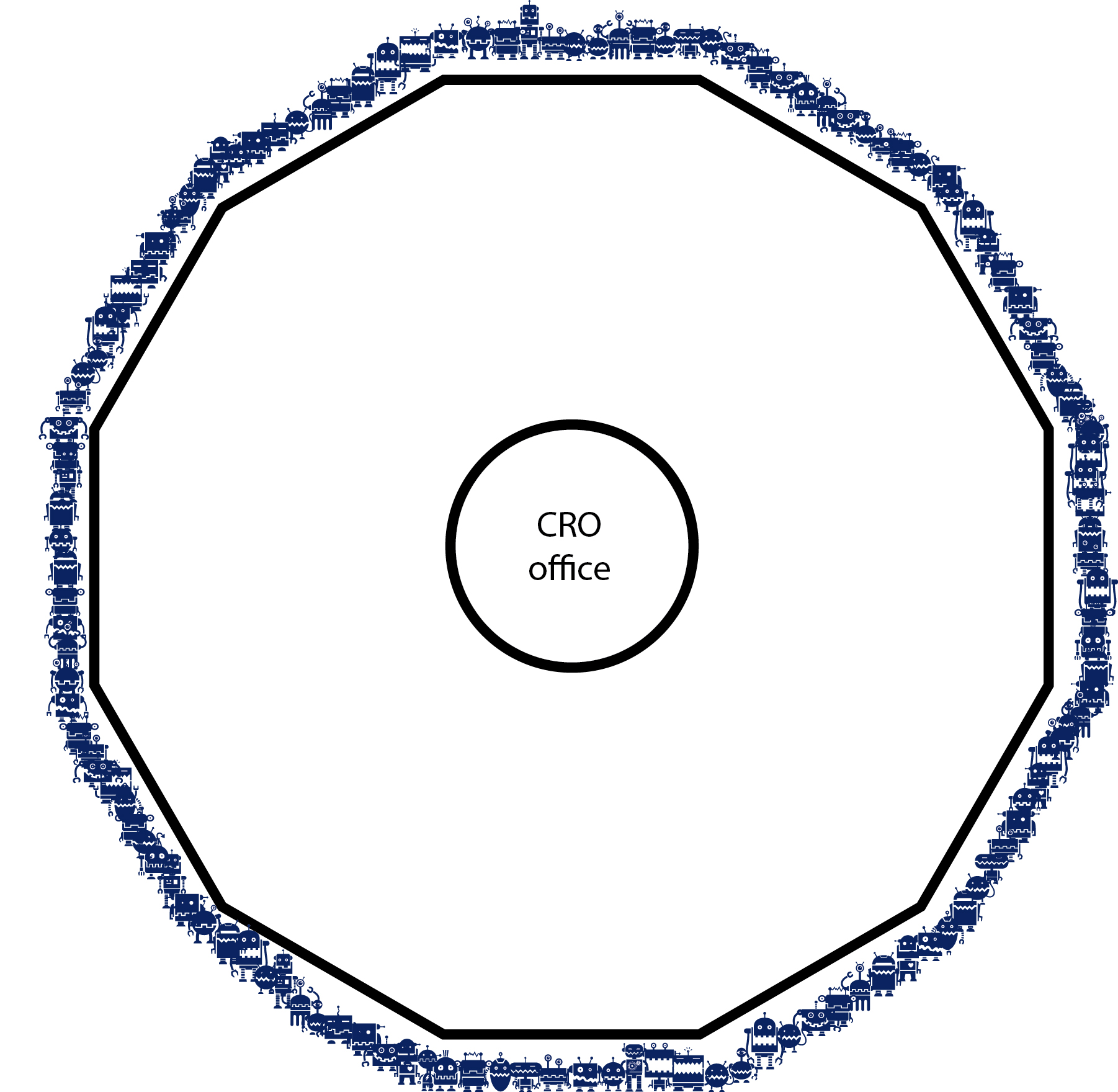 The owner at the puzzle factory wished to arrange all her puzzle-making robots into 12 rows of 11 robots each, and to position all the rows an equal distance from her circular office in the center of the factory. Her CRO (Chief of Robotic Operations) initially protested that there were only 120 robots in the factory.