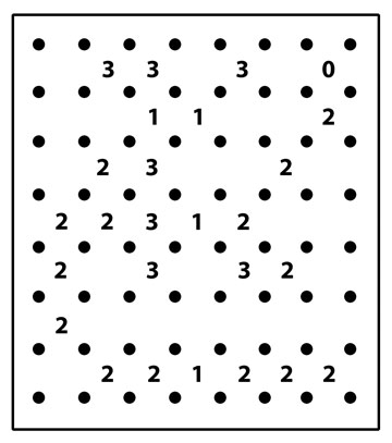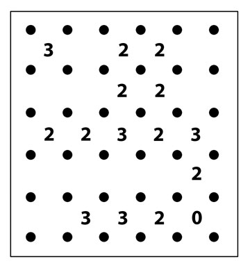 The rules are simple. You draw lines between the dots to form a single route (or ‘loop’) without crossings or branches. The numbers in each square indicate how many lines will be drawn about that square. A square with no number can have any number of lines bounding it. You can use logic to solve these puzzles, guessing should not be required.