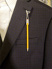 Now, the trick: without untying the string, or sharpening/shortening the pencil – can you loop the pencil/string assembly through a button hole? Like this: