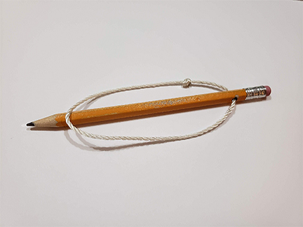 To setup this puzzle: drill a hole in a pencil and tie a loop of string through the hole (as shown in the picture). Make sure that the loop of string is short enough that it will NOT pass over the long end of the pencil (the pointy end).