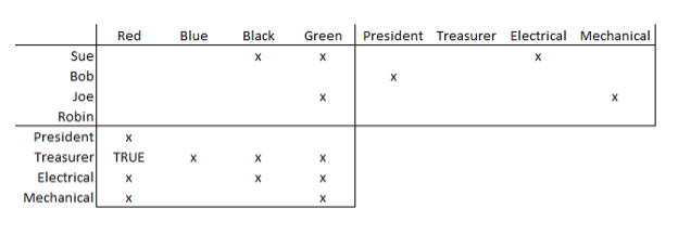 You are told that the President is better at math than Bob, and that Sue and the Electrical Lead often play video games with the team members in black and green shirts. Joe and the Mechanical Lead have lunch with the team member in the green shirt, but that isn’t the treasurer, as the treasurer always wears red.