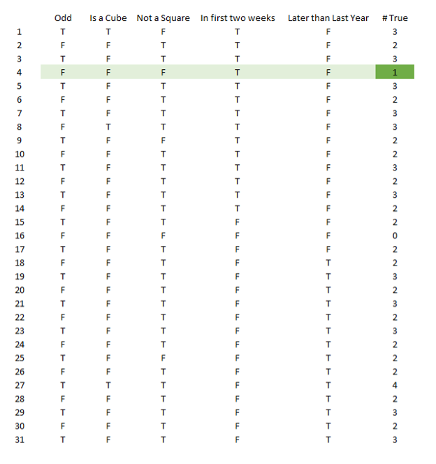 The annual Liars Club Dinner is (again) planned for May, but none of the members know which night the event will be held. That doesn’t stop some of the members from making the following claims at the March meeting: The first member stands to speak and claims that the date will be an odd number. A second member states that the date is a perfect cube, while the third member to speak reports that the date is not a perfect square. After the meeting, the president confides to the board that the meeting will be in the first week of the month. But the membership director (who is always having trouble collecting dues from deadbeat members) insists that the date must be later in the month than the date on which the event was held the previous year. That date is known to have been the 17th.
