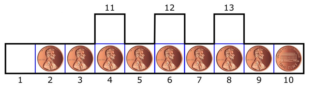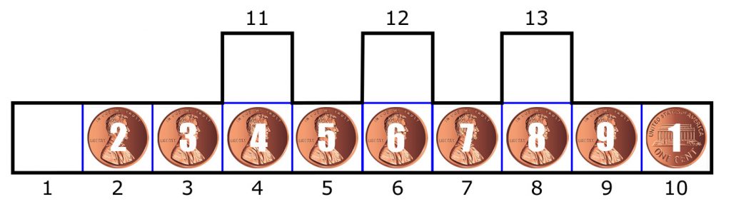 Given the diagram below, what is the minimum number of “moves” to get the obverse penny (in square 10) to the far left end of the row (square 1). The pennies may NOT be lifted from the page, nor can they leave the bold-bounded area. When counting each “move” a penny can move any distance possible (subject to those two constraints) in a single move.