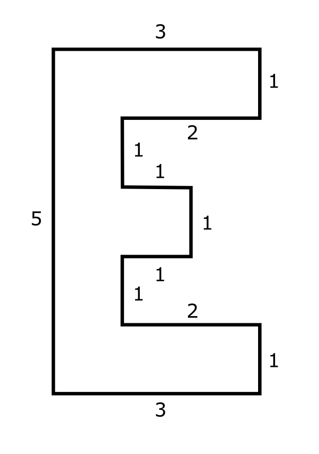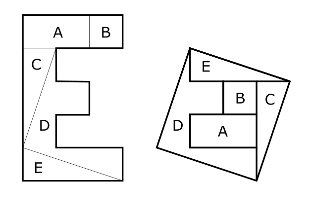 Can you cut the “E” into five shapes that will reassemble into a perfect square? No flipping of the cut parts. The dimensions are shown for clarity.