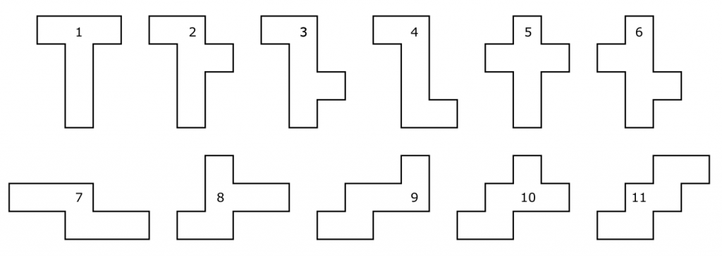 A total of 11 shapes are possible (without the mirrored versions). If you count the mirrored versions there are 20 total. Shapes 1 and 5 are identical if mirrored.