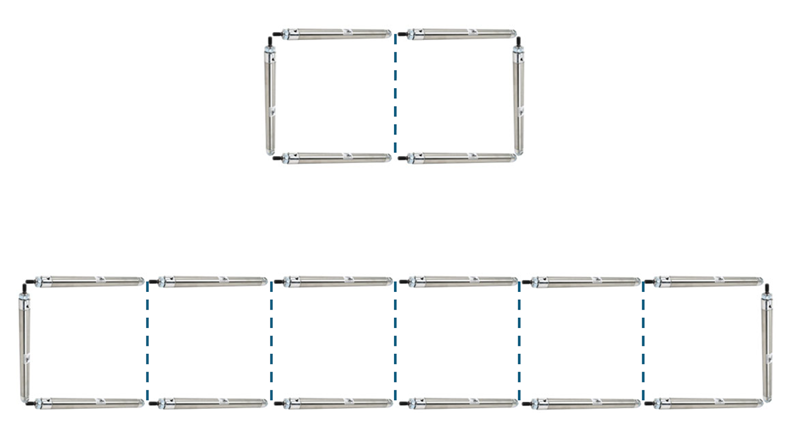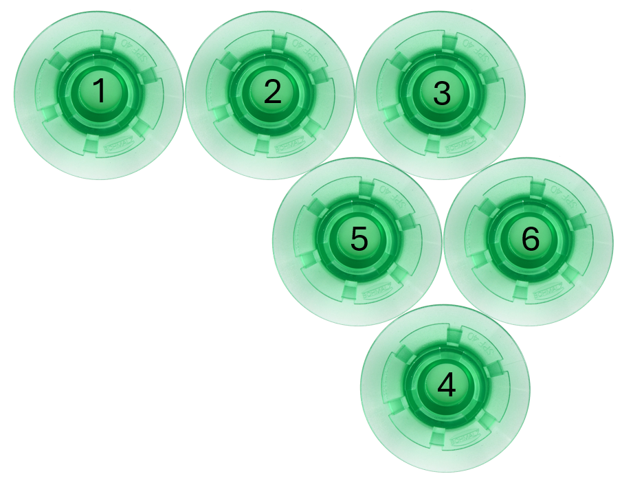 Start by positioning the six objects into two rows as shown. They will self-align if touching at these nine points:
