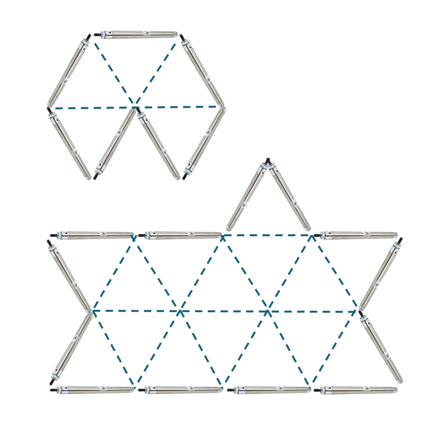 Shown below are 20 pneumatic cylinders, divided into groups of 6 and 14 and forming two enclosed shapes. The area of the larger shape is exactly 3 times larger than the smaller (the dashed line are shown only to help envision the sizes of the enclosures). Can you divide the 20 cylinders into groups of 7 and 13 and accomplish the same arraignment (i.e. create two closed areas with one area exactly three times larger than the other)?