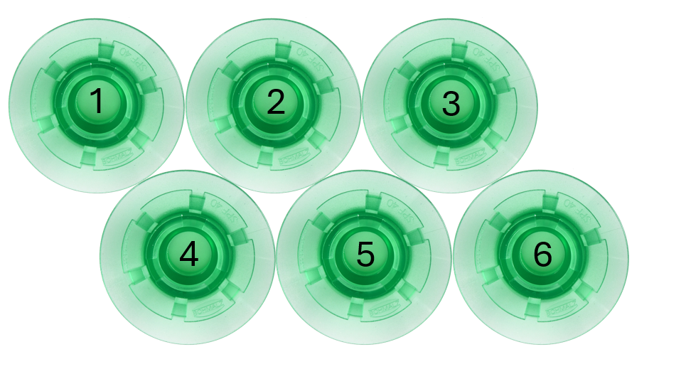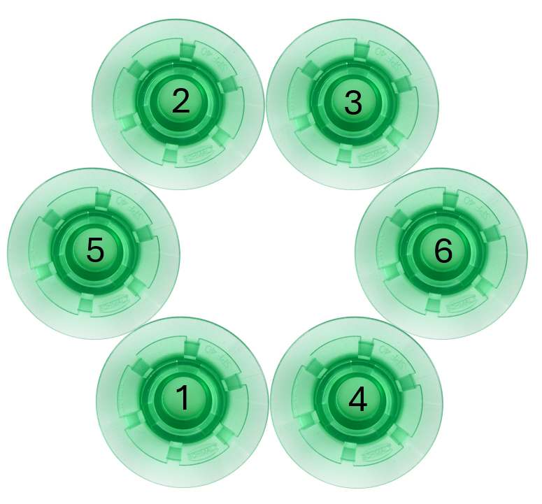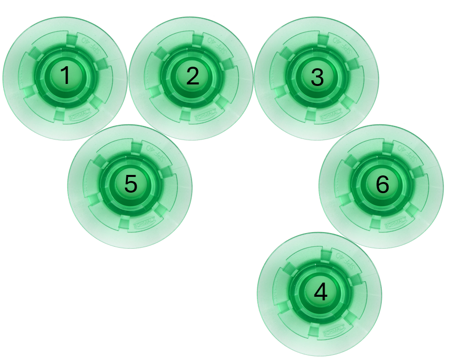 Can you place 6 suction cups on a flat surface and then slide them into the exact arrangement shown? (feel free to use identical coins if you don’t have six suction cups at hand) The round objects must be positioned exactly, not “by eye”, and you may not lift any of them from the surface – or the solution would be trivial. No measuring or marking should be needed, you just need the six objects, and a clever method.