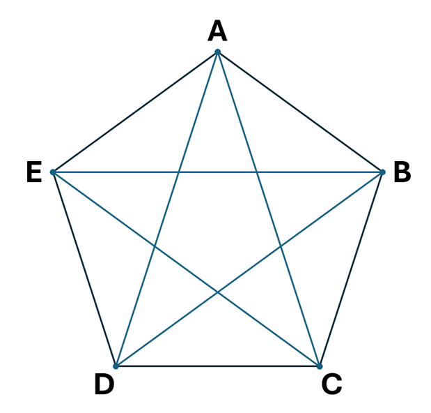 The programmer for the gasket applicator robot at the puzzle factory noticed that there were a number of different tool paths that could be used to program the gasket path required for a new mechanical puzzle. The complete pattern is shown below. He must apply the gasket in a continuous bead along all the lines shown, but he can only change direction at the outer points (labeled A-E) with no interior turns. And all tool paths must begin (and end) at the point labeled A. How many possible paths are there?