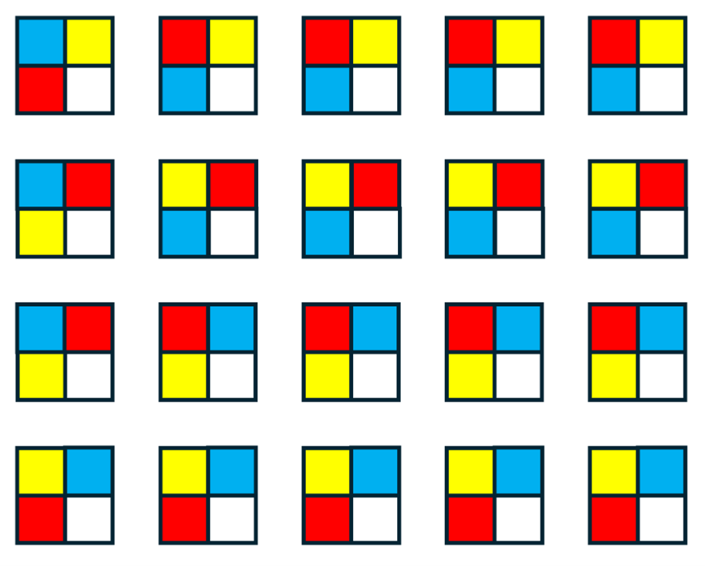Can you arrange any 16 of the following tiles into a square such that like colors (of all the tiles) are touching on all sides? You can choose any of the 16, and you may rotate the tiles as needed.