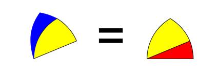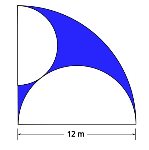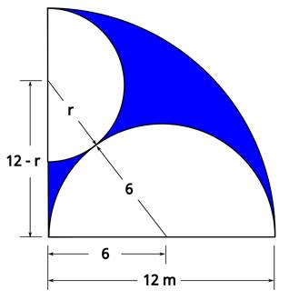 And thus: the area of blue shaded portion is the area of the big quarter circle less the areas of the two smaller half circles: 36π – 18π – 8π = 10π (or approximately 31.4)