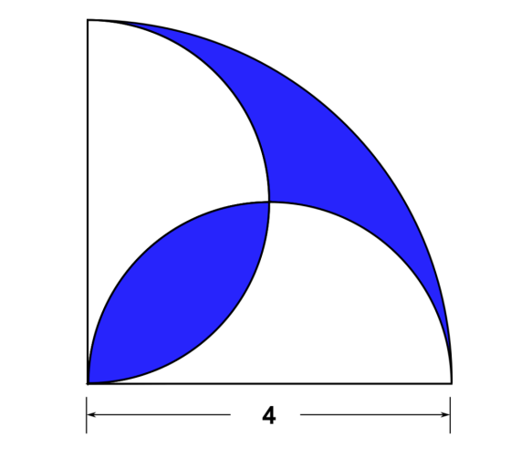 It’s obvious by inspection that the area of the blue shaded portion is equal to the area of the big quarter circle minus the areas of the two smaller half circles. The area of the big quarter and lower half are easy to calculate. But we need to know the radius of the upper half circle, in order to calculate its area.