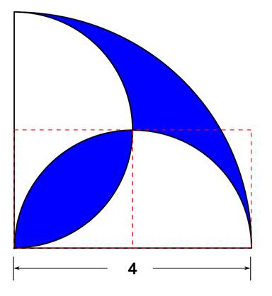 Therefore, the area of the entire blue shaded portion is 4π – 8 (or approximately 4.566)