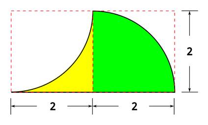 The yellow shaded portion has an area of 22 – 1/4π22 = 4 – π