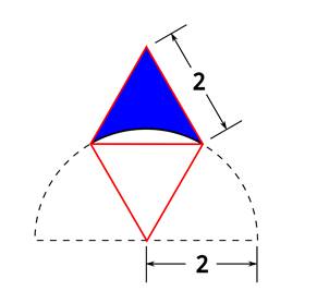 From this figure, it’s possible to subtract 1/6 the area of a 2” radius circle from the area of two of the equilateral triangles to determine the area of 1/6th of the total blue area.