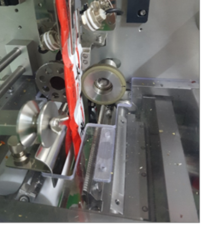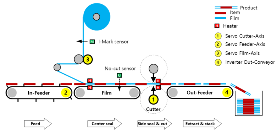 Non-motion components include an eye-mark sensor to synchronize the film feed with conveyor speed, and a “no cut” sensor to prevent cutting if an item shifts or line shafts lose synchronization.