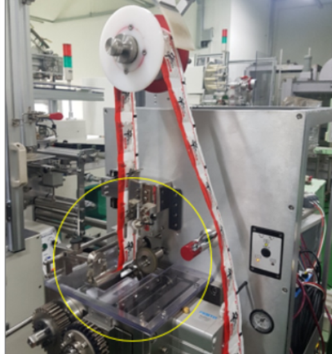 The machine consists of three modules: an infeed module, a film module that wraps and seals the product in the plastic film, and an outfeed module (see Figure 3). The film module includes heaters that form a 2X wide seal between individual items. A rotary knife between the film module and outfeed conveyor cuts that seal in half to separate the product into discrete items, and a second pair of heaters seals the side of the packet before it is released to the out feeder.