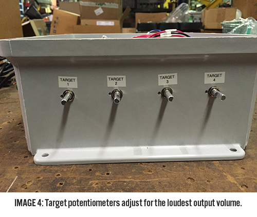 To test the unit, simulated positions were set on the analog simulator (encoder). For each encoder position, a target potentiometer was adjusted for the loudest output volume. After all of the positions were set, the simulated encoder swept over the full range to confirm the volume changes at the targets.