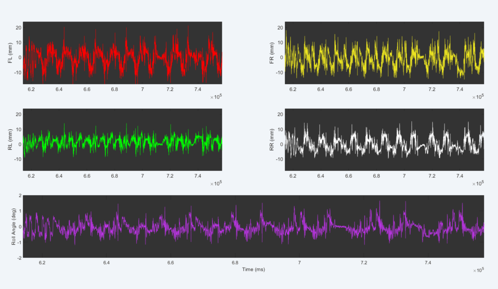 Additionally, using that information, we can then identify scenarios when the vehicle either exhibits too much or too little yaw moment – the balance of the vehicle. For a given slip angle, lateral acceleration, and turning radius, there should be a corresponding steering angle based on the data collected from above. The deviation of actual steering angle reveals whether the vehicle is under or oversteering. Below is a chart that shows potentiometer travel for each corner of the vehicle. That is then used to calculate the roll angle of the vehicle (shown in purple).